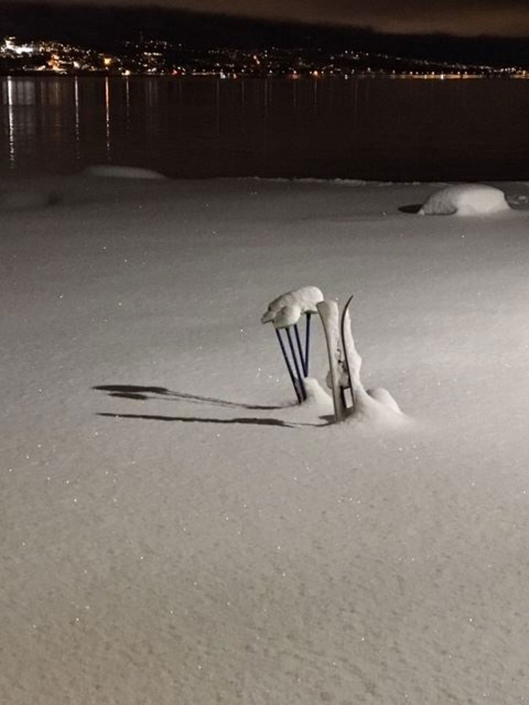 Ett par gjenglemte ski ble forlatt en ettermiddag i januar. Resulterte i et flott kunstbilde i vinterlandet der nede.
