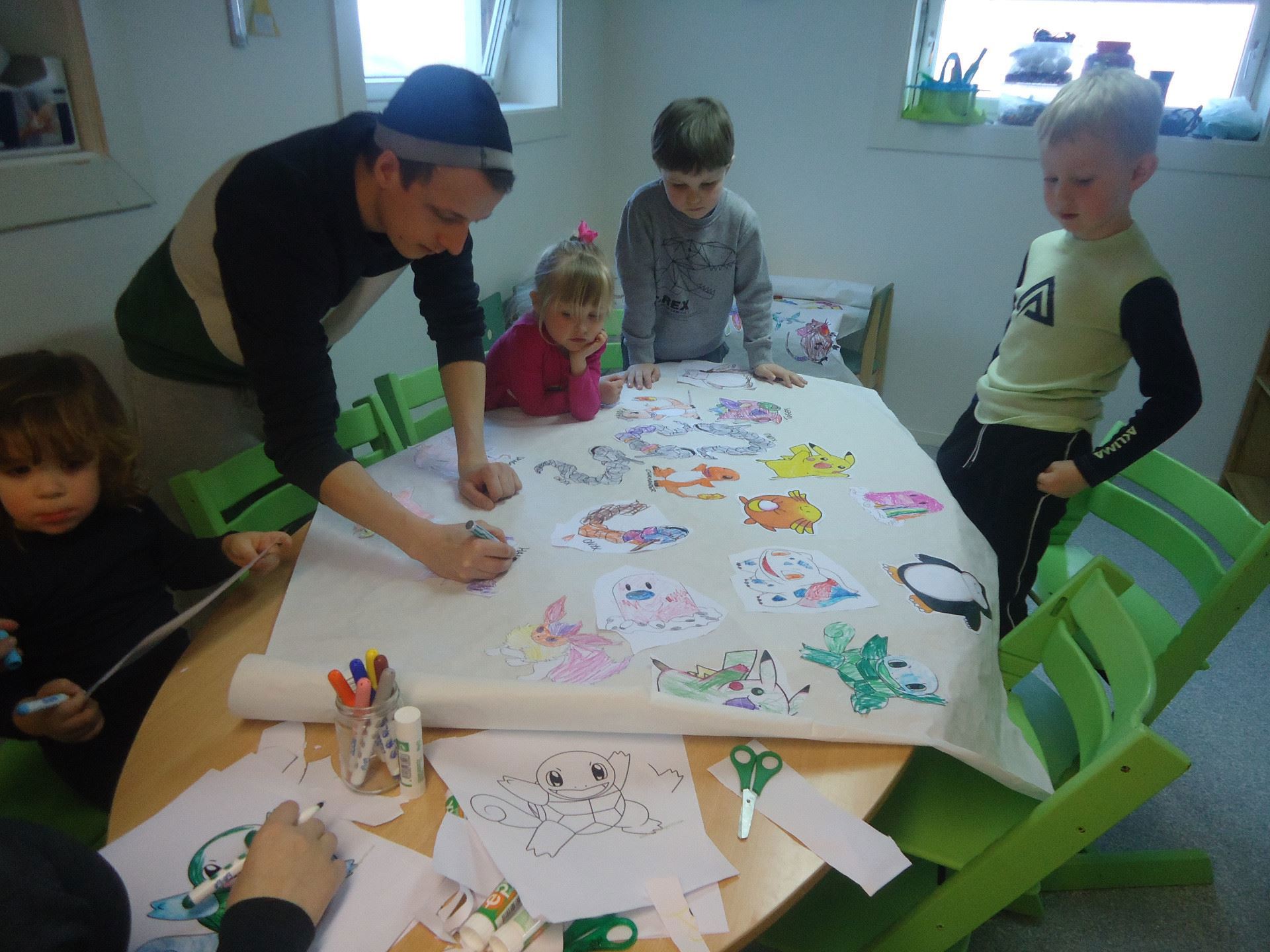Når vi feirer barnas bursdag gjør vi det til en tema aktivitet. Denne 6-åringen vår er opptatt av Pokemon så det måtte bli en Pokemon dag! Her sluttfører vi pokemon duken som skal ligge på bordet. Veldig engasjerte barn hjalp til med fargelegging, klipping og liming. Under festen smakte vi på "Squirtle -punsj" (isvann med grønn konditorfarge).