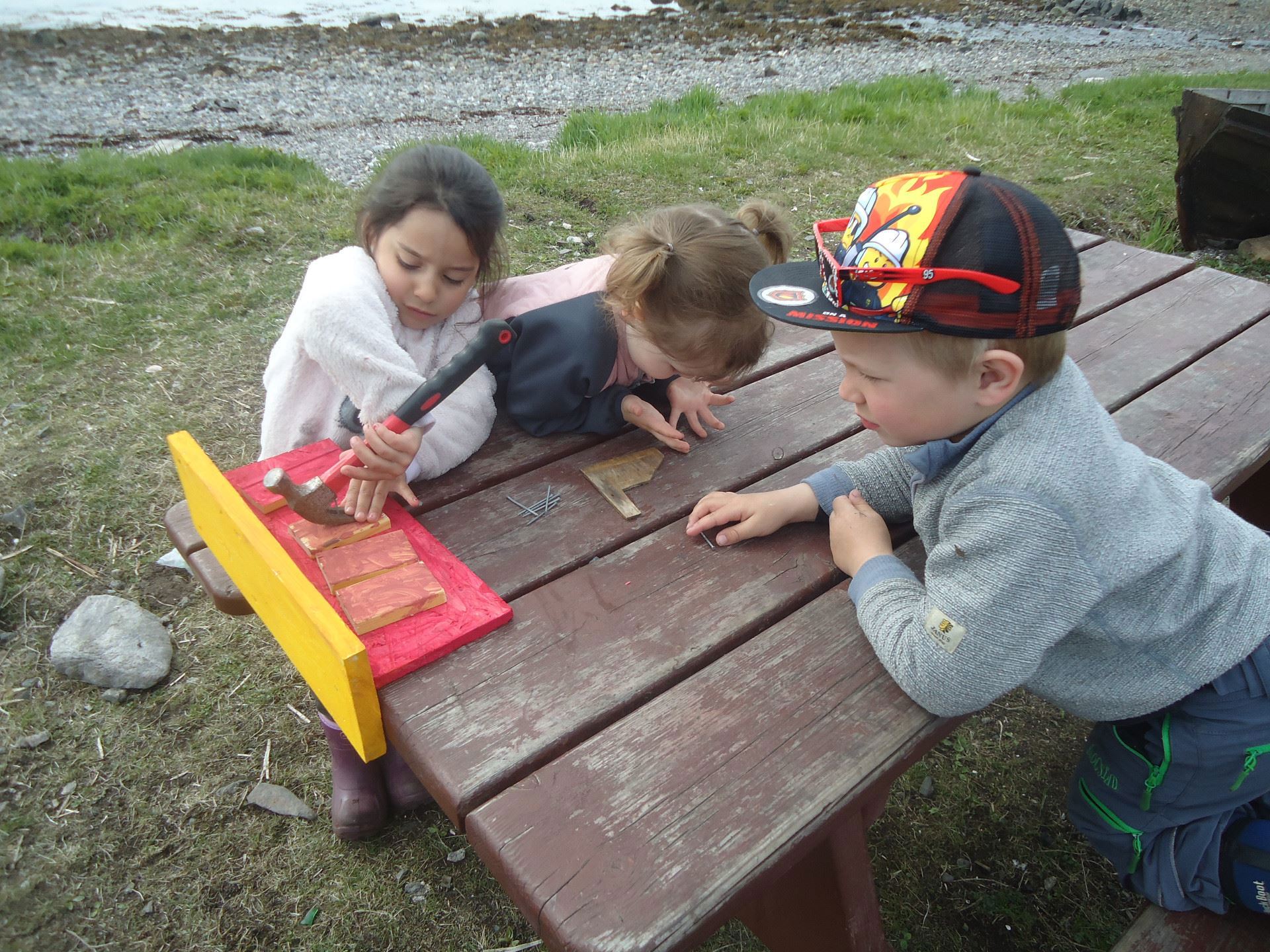 Naustet er innredet og innbyr til snekring, saging og maling. Barna får utfolde seg og det er stor kreativitet der borte nå om dagen.