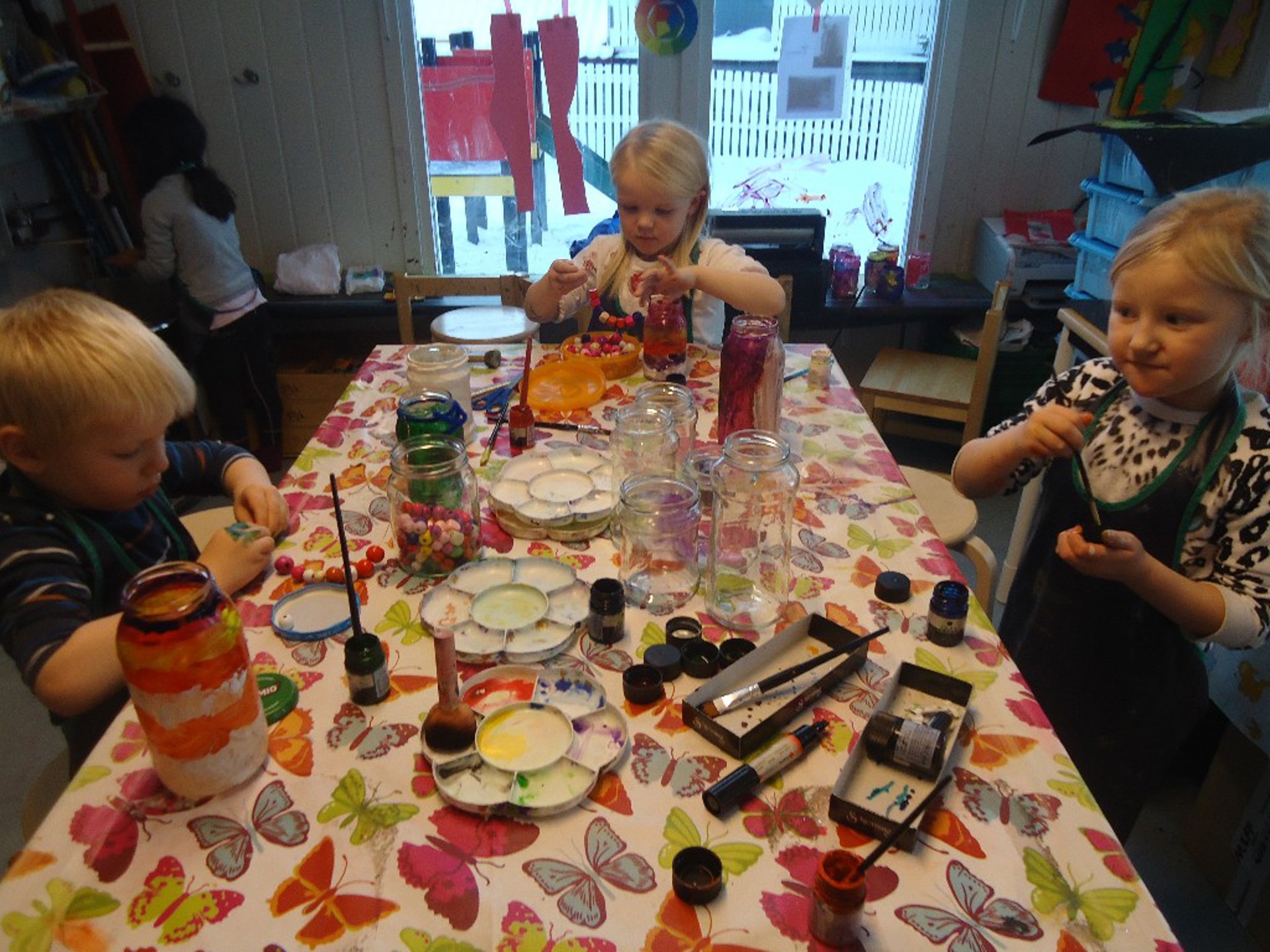 Når mørketida er over oss så er det blitt tradisjon i barnehagen at barna får lage sin egen lys lykt som skal lage stemning på avdelinga hele desember måned. Kunstrommet er daglig i bruk for kreativ utfoldelse. Vi blander farger for å lage nye farger og når lykta er ferdig putter vi oppi batteridrevne te lys.