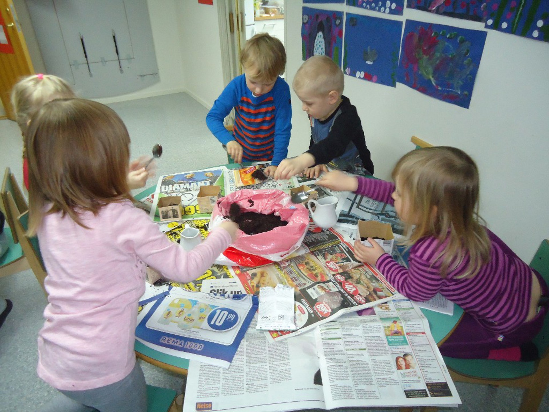 Det er artig å plante frø. Det blir spennende å se om vi får sukkererter! Vi må huske å vanne planten mye, det var barna enige om.