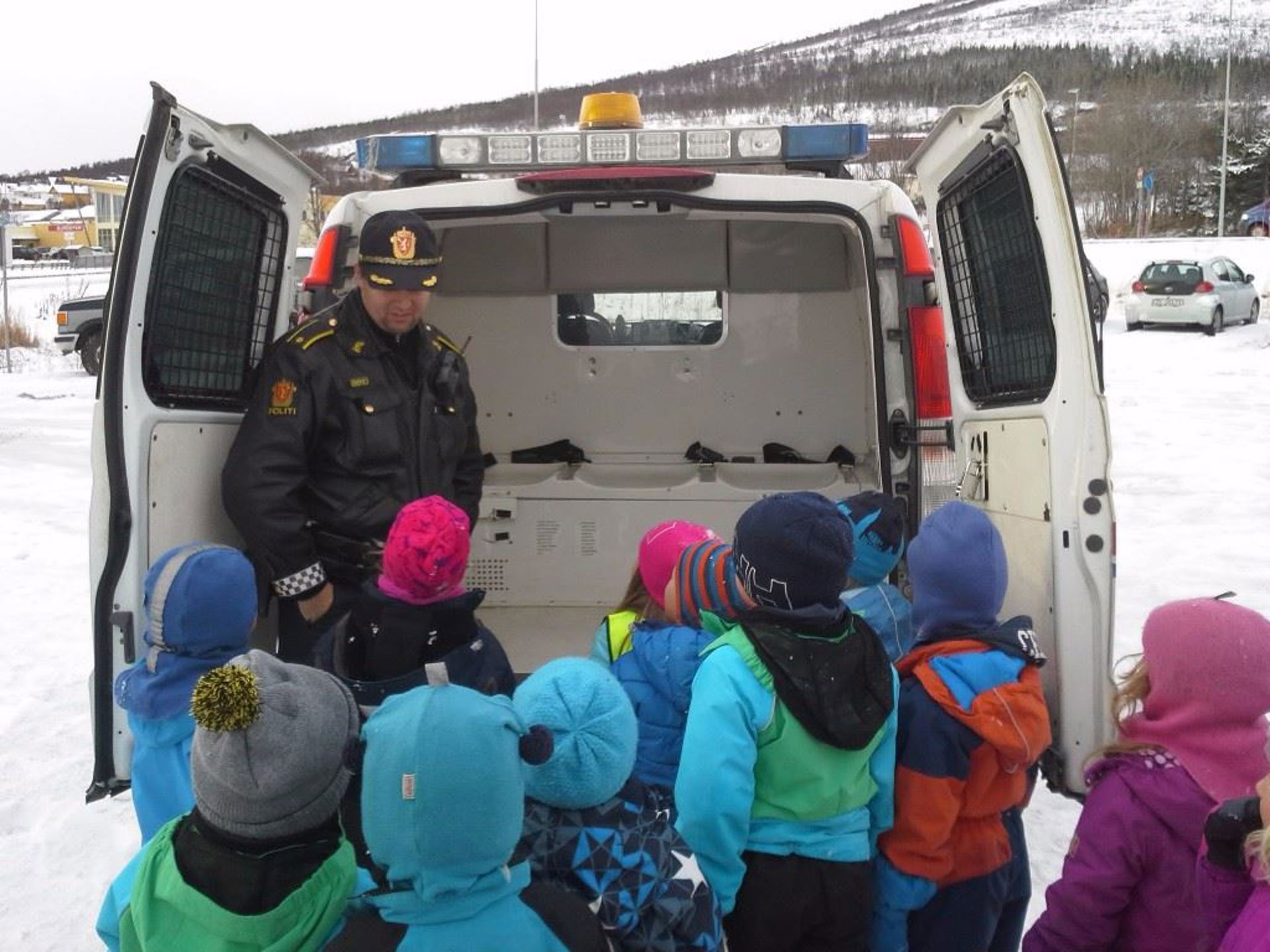 I dag fikk Tusseklubben besøk av politiet. Det syntes unga var kjempespennende. De som ville fikk sitte inne i politibilen, bak i "fengselet" og prøve håndjern.