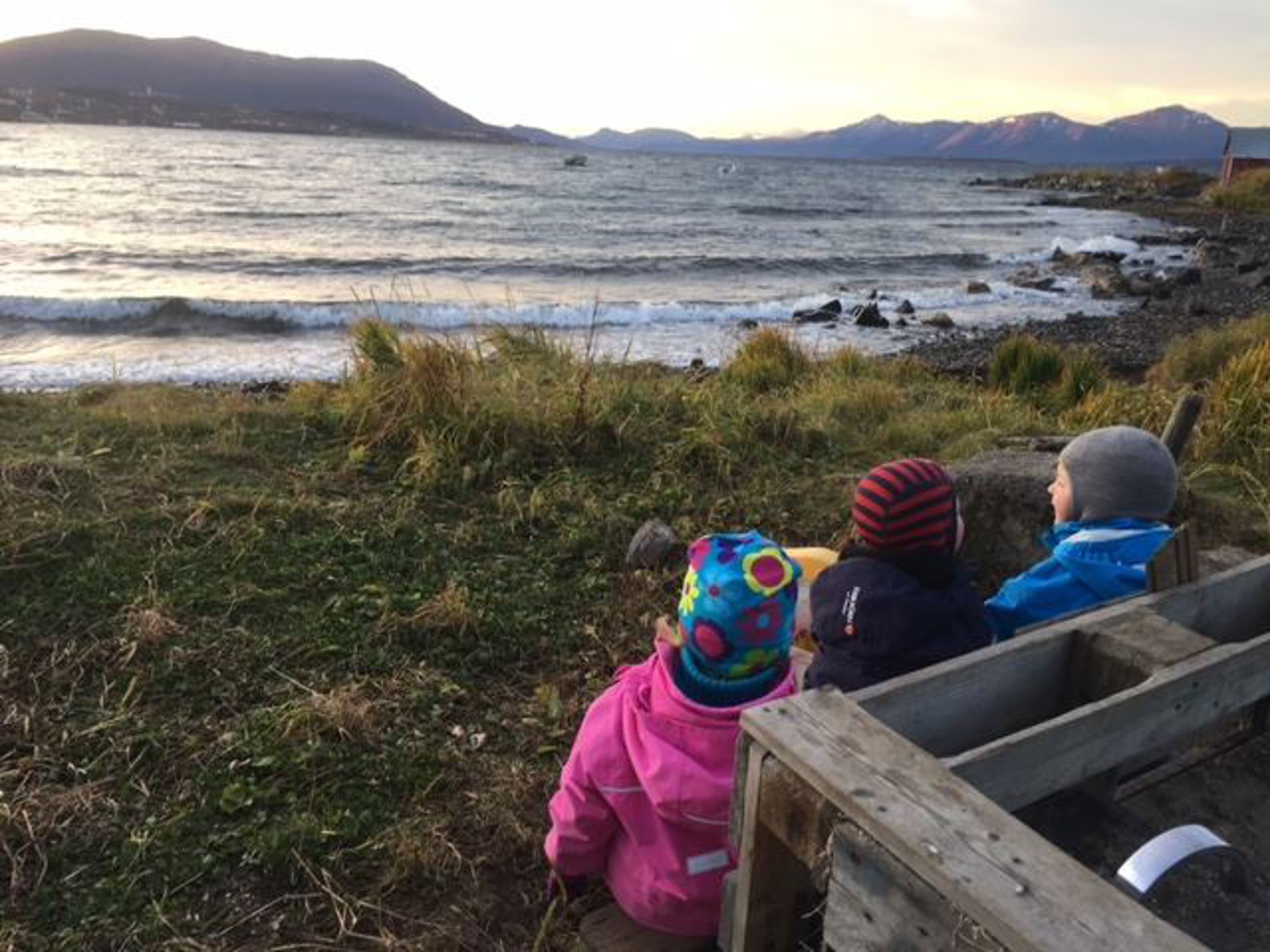 Barna fra Trehørningen har benket seg opp og beundrer bølgene på sjøen en tidlig oktober morgen. De kommenterer også fargen på himmelen og en oppdager månen. Mye å oppleve og sanse ute som gir viktig læring også for de små.