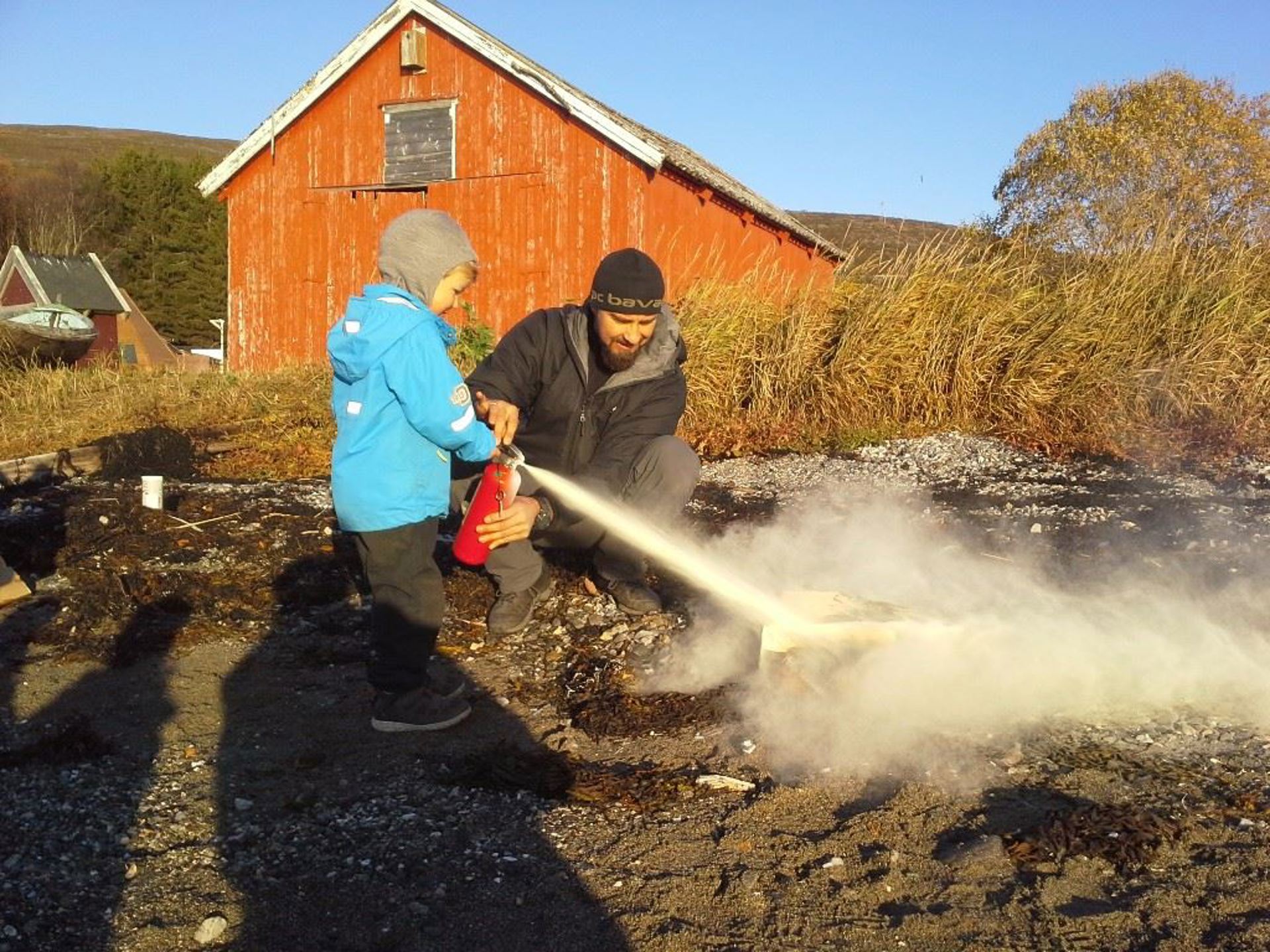I dag øvde vi og viste forskjellige måter og utstyr til å slukke brann. Vi prøvde brannpulver, brannteppe og brannslukkingsapparat, og det var selvsagt mest gøy!