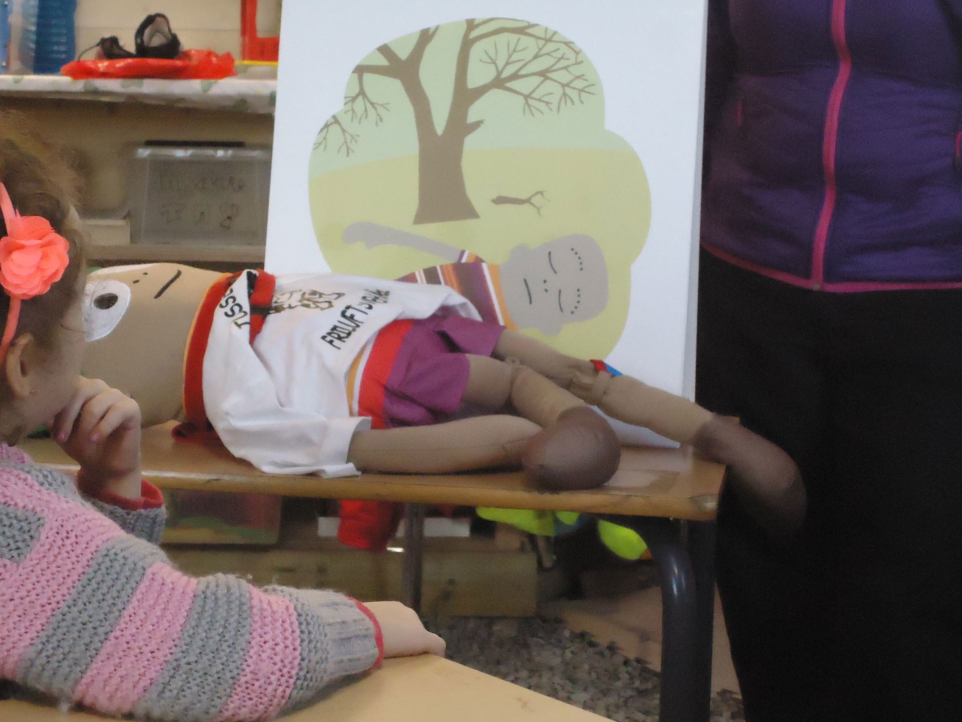 I dag besøkte Henry (fra Røde Kors) tussene i lavvoen. Barna ble kurset i enkel førtehjelp og de var aktive deltakere og kom med mange innspill og egne historier. Vi lærte også at det å spørre om noen vil bli med på lek, det er også en form for førstehjelp. I akebakken ute etterpå, øvde vi oss på førstehjelp og noe av det vi hadde lært.