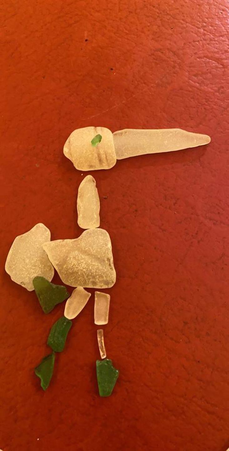 Med fugler som tema har Blåmann plukket små glassbiter i fjæra og laget fugle bilder. Hva heter denne arten tro? En sjelden fugl å se i Løkåsfjæra.