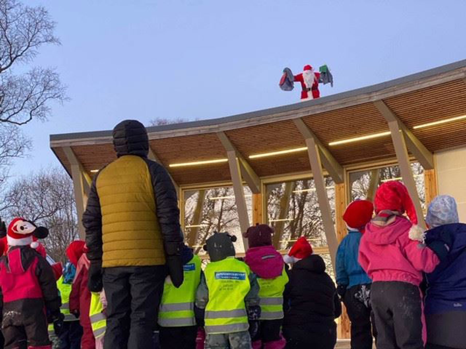 Vi samlet barna utenfor fjærahuset. Da hørte vi lyden av reinsdyrene til julenissen.Bjellene til Rudolf! Plutselig oppdaget vi nissen i egen person oppå taket. Det var skikkelig spennende at nissen hadde tatt seg tid til å besøke oss nå rett før jul. Han hadde med gaver til barna som han heiste ned i et tau.
