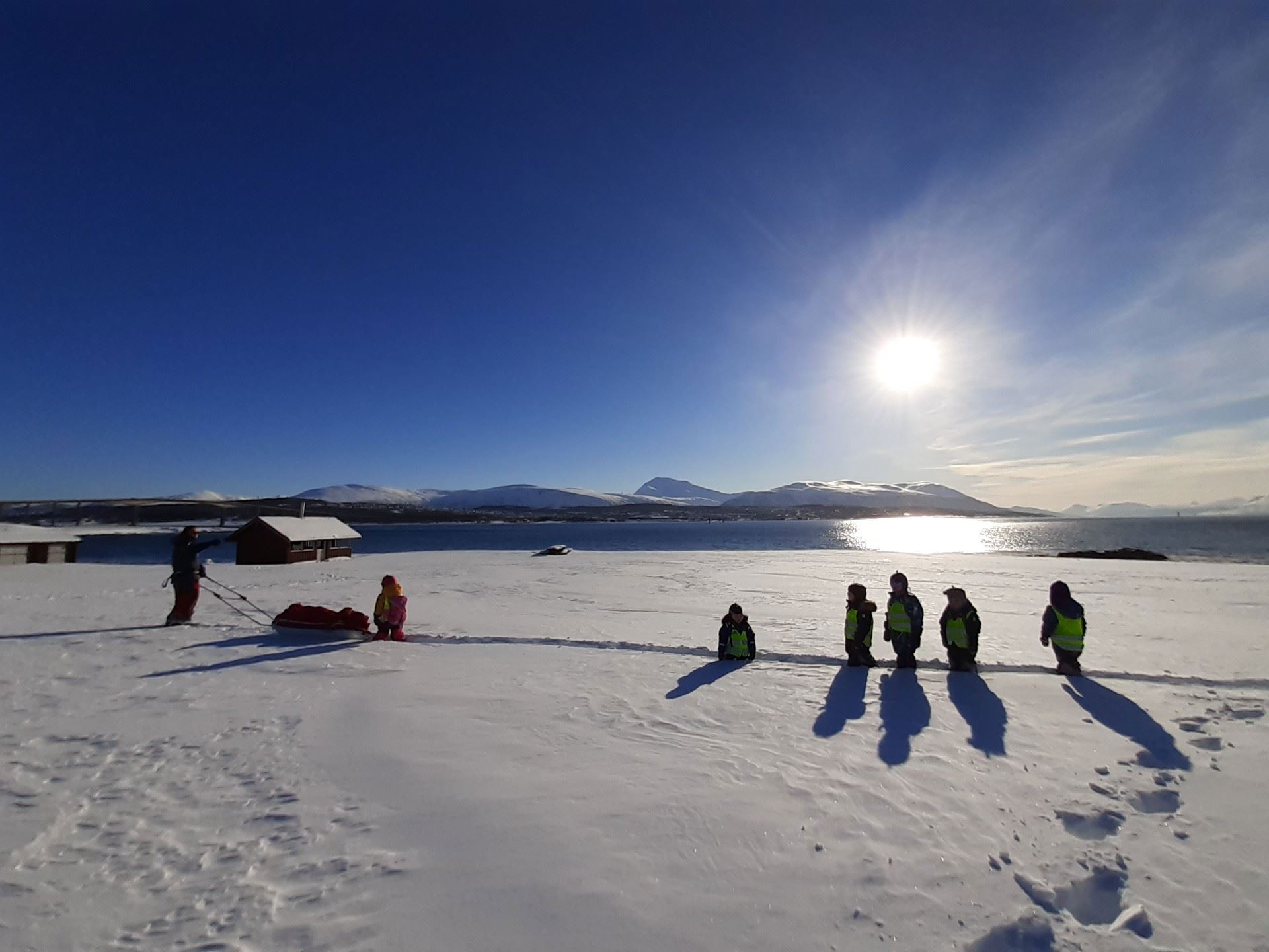 3-åringene på Sørtind gikk på tur over jordet og til Finnland. Der lagde vi akebakke, bål og klatra i et tre.