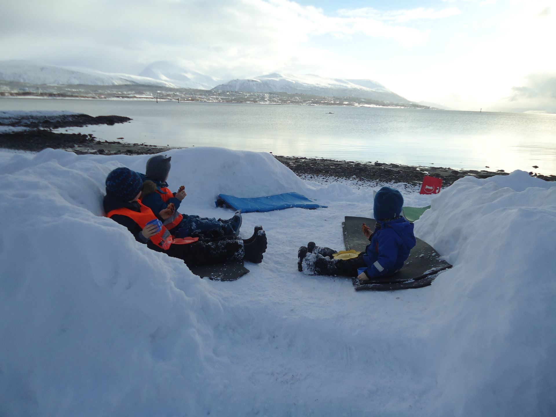 Bildet er fra en av de flere utelunsjene vi har hatt den siste tida i fjæra. Nydelig vinterstemning og den fantastiske utsikten! Her har tre barn fra Nordtind funnet seg til rette og oppdager plutselig en kajakk ute på havet!