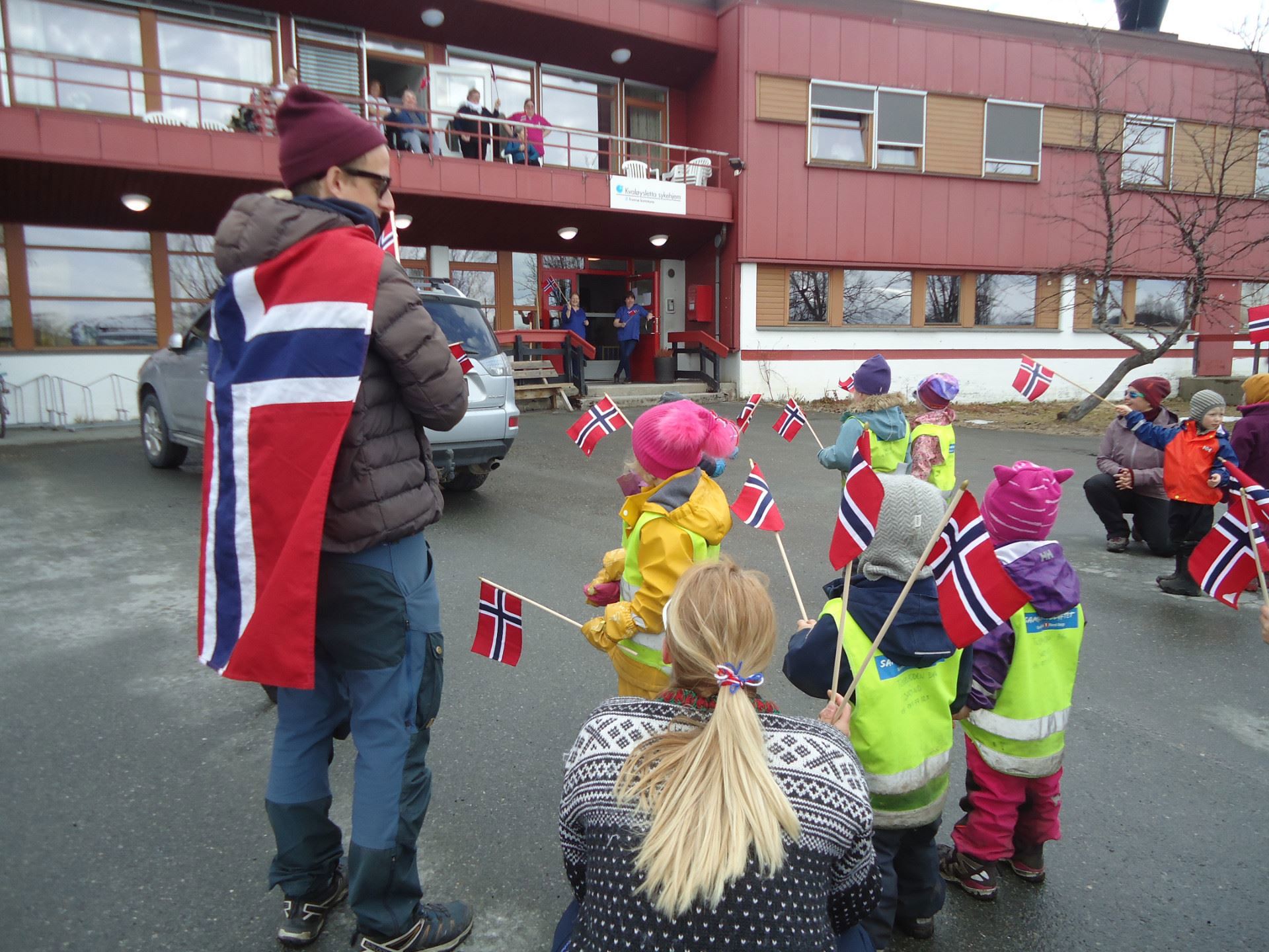 Nordtind og Sørtind gikk 17.mai marsj opp mot sykehjemmet. Vi stoppet ved sykehjemmet og sang to vårsanger til de gamle som satt på verandaen og viftet med flagg til barna. Vi fikk 17.mai stemning med korps musikk på høytaler underveis på turen. Noen av barna hadde med seg tromme også!