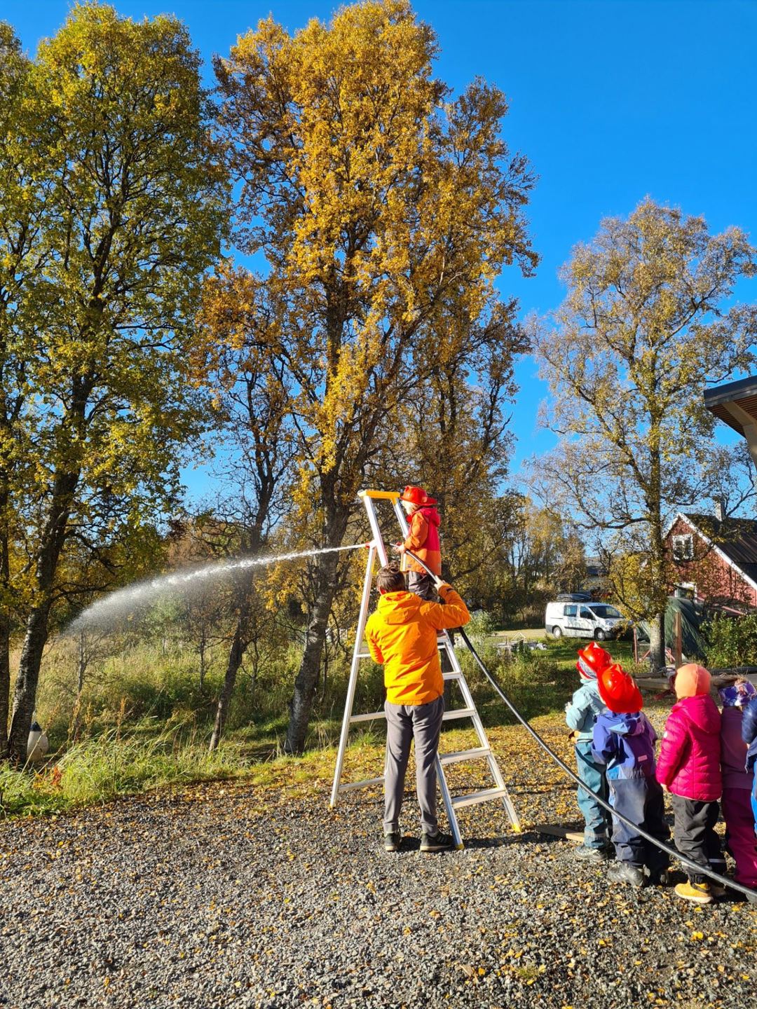 På Sørtind tok vi idag ut brannslangen vi har i fjærahuset for å sjekke at den fungerer som den skal, og alle som ville fikk lov å teste den ut. Barna koset seg med å klatre opp i stigen og sprute vann på trærne. Ekstra spennende ble det da de klarte å sprute ned bladene på trærne.