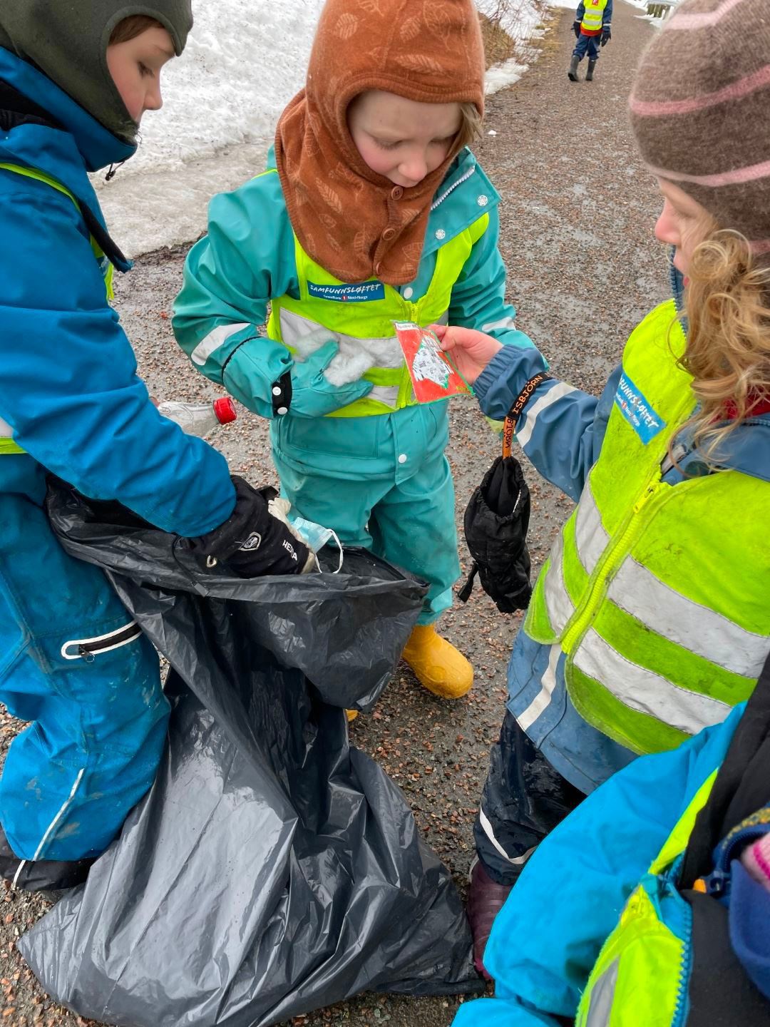 Vi lærer barna at det er en fin ting å plukke søppel ute i naturen. Vi må ta vare på naturen. Derfor er vi ofte på sånne oppdrag! Denne dagen var det Nordtind sine skolestartere som gjorde jobben.