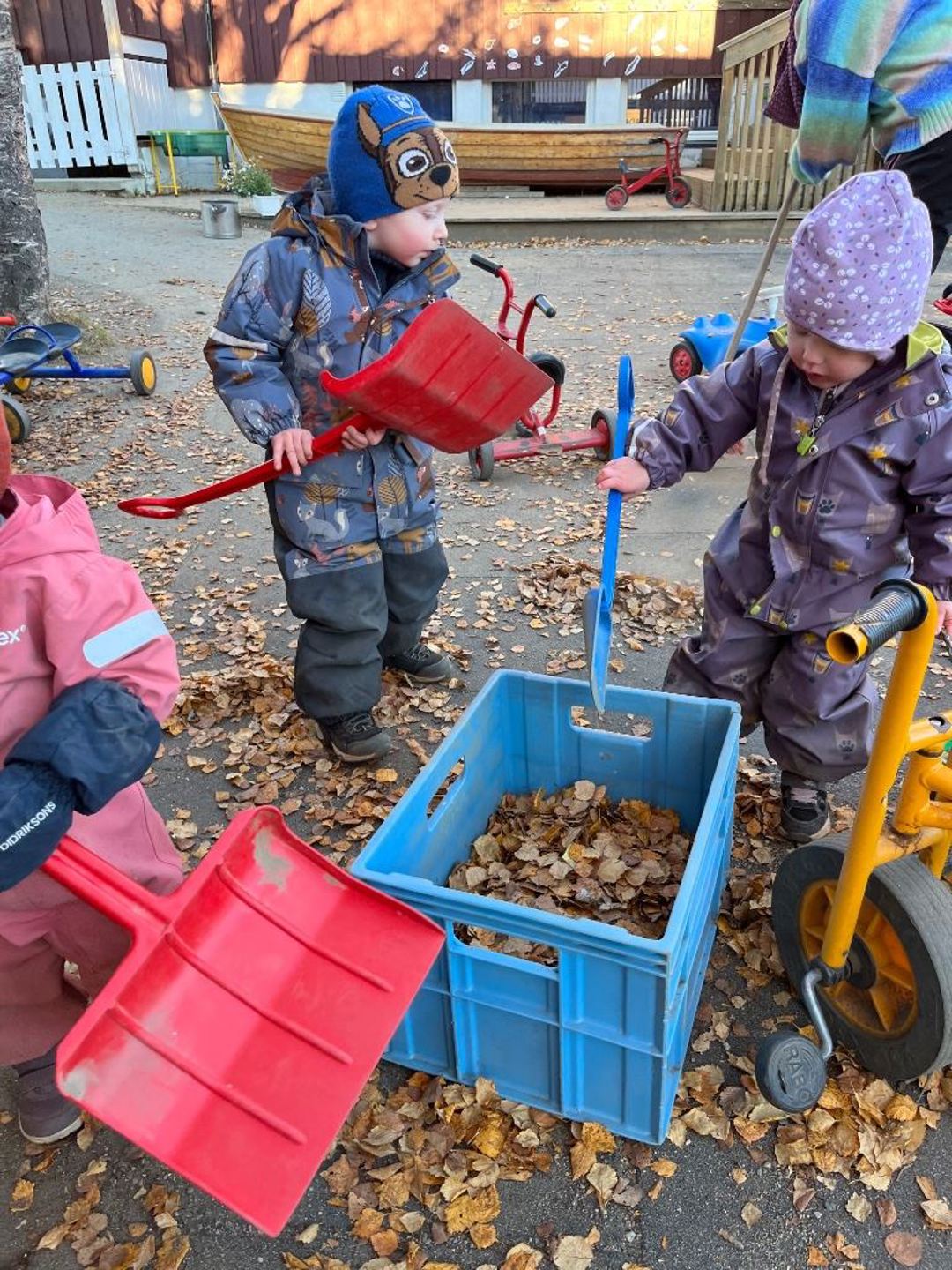 Barna på Kjølen går foreldre-dugnaden i næringa. De koster og måkker for å samle bladene i kompostbingen til barnehagen.