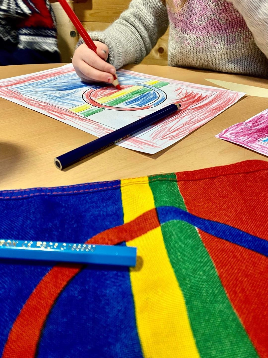 Når vi jobber med samisk kultur, er noe av det første barna lærer om, det samiske flagget og fargenes betydning. På Nordtind avdelinga har vi laget en samisk vegg med flotte flagg, tegninger og samiske bilder. Etterhvert som barna produserer, får de henge opp det de lager på veggen.