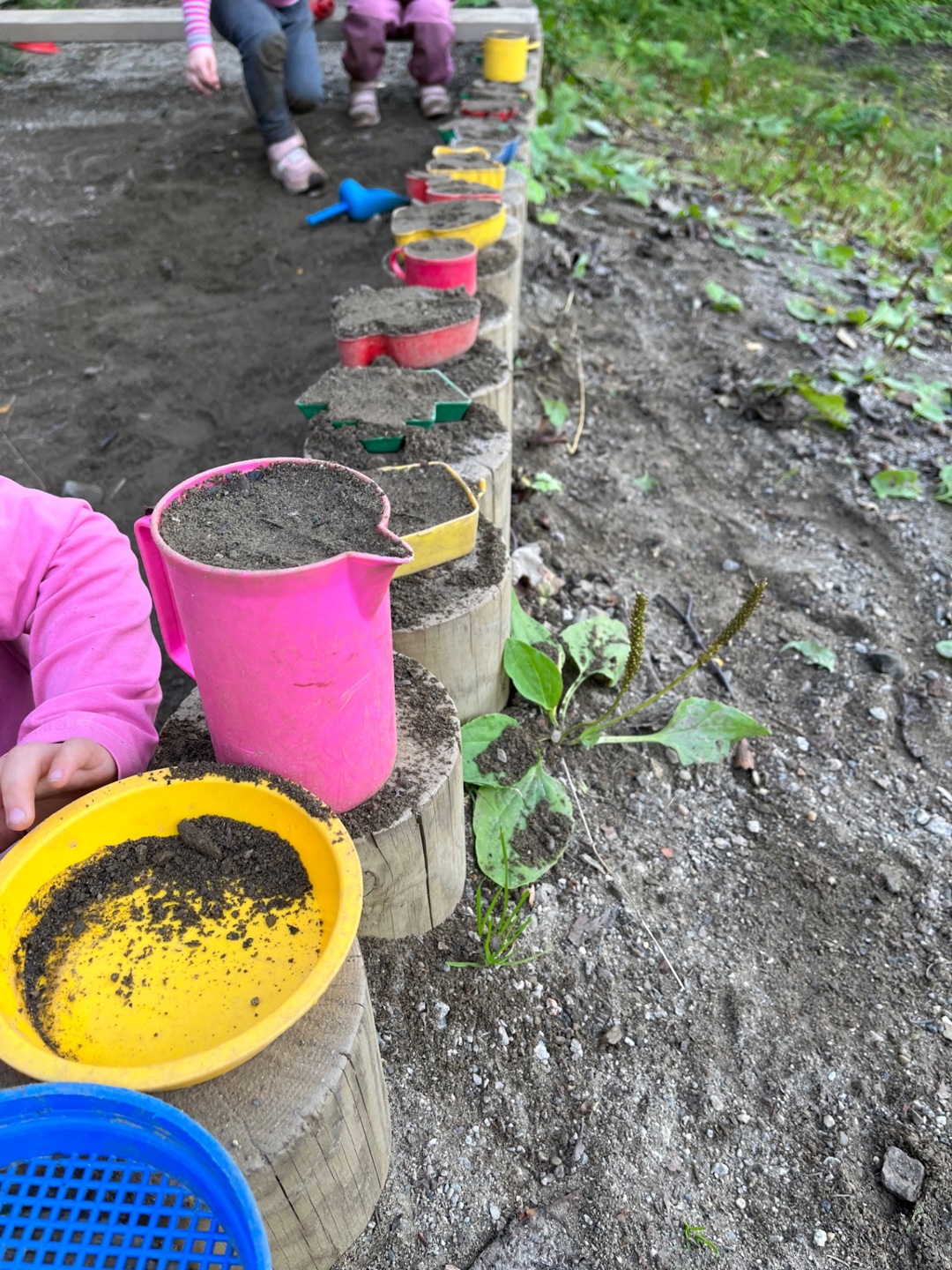 To- og treåringene på Rautind har åpnet kafé i dag! En lang, lang rekke med herlige delikatesser. Her serveres sandkaker, sjokoladekake, spagetti og fisk.