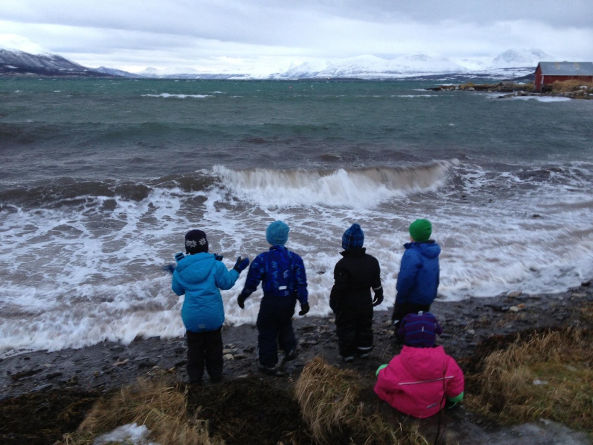Friluftsgruppene Trehørningen og Gråtind fikk kjenne på været i dag. Store bølger skylte i land og vi fikk høre på dønningene som med sin rytme laget musikk til høye frydfulle hyl fra barn som kjente på spenningen.