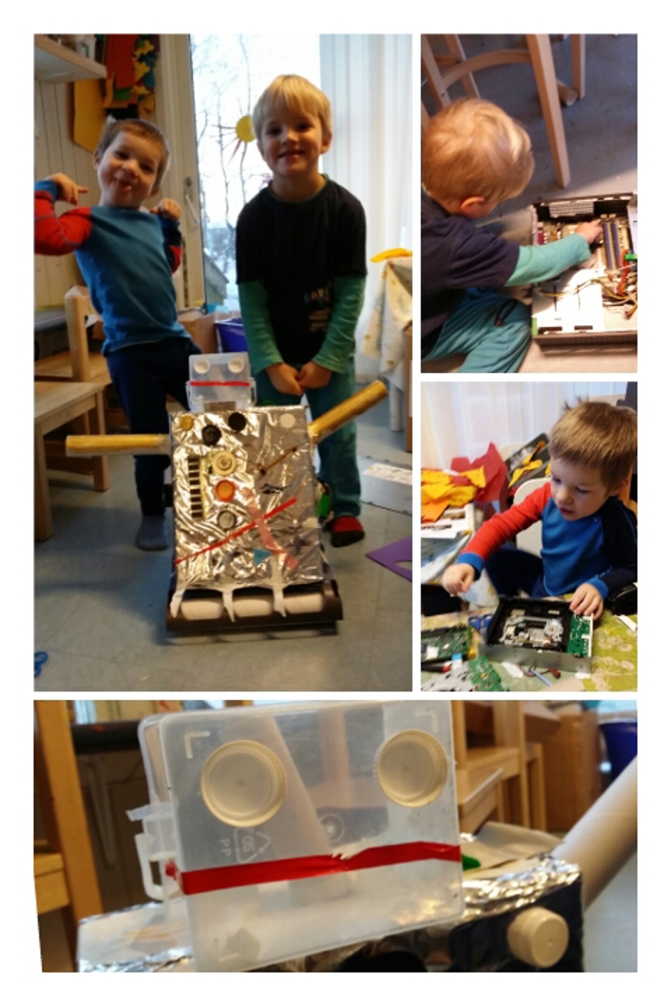 I den siste tiden har Eskil vist stor interesse for alt som har med roboter å gjøre. Så derfor fant vi ut at man selvfølgelig måtte få laget en robot på kunstrommet. Sammen med Jørgen plukket han deler fra en gammel datamaskin. Og med litt forskjellig skrot satt sammen ble det tilslutt en robot; nærmere bestemt slimrobot :)