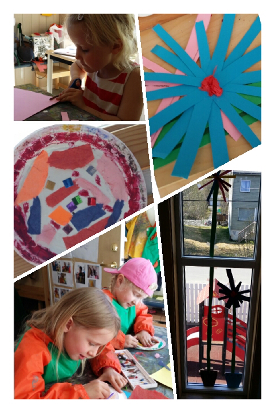 Fredags ettermiddag var det nydelig solskinnsvær så døra til kunstrommet sto på gløtt. Grupper med barn fra både Blåmann og Rautind var innom for litt kreativ utfoldelse. Barna fra Rautind lagde "mango-hatter" til sommerfesten. Som inspirasjon fikk barna studere en ekte mango (som selvsagt måtte smakes etterpå :-) Mens barna fra Blåmann lagde nydelige langstilkede vårblomster til å pynte vinduene i trappoppgangen til loftet.