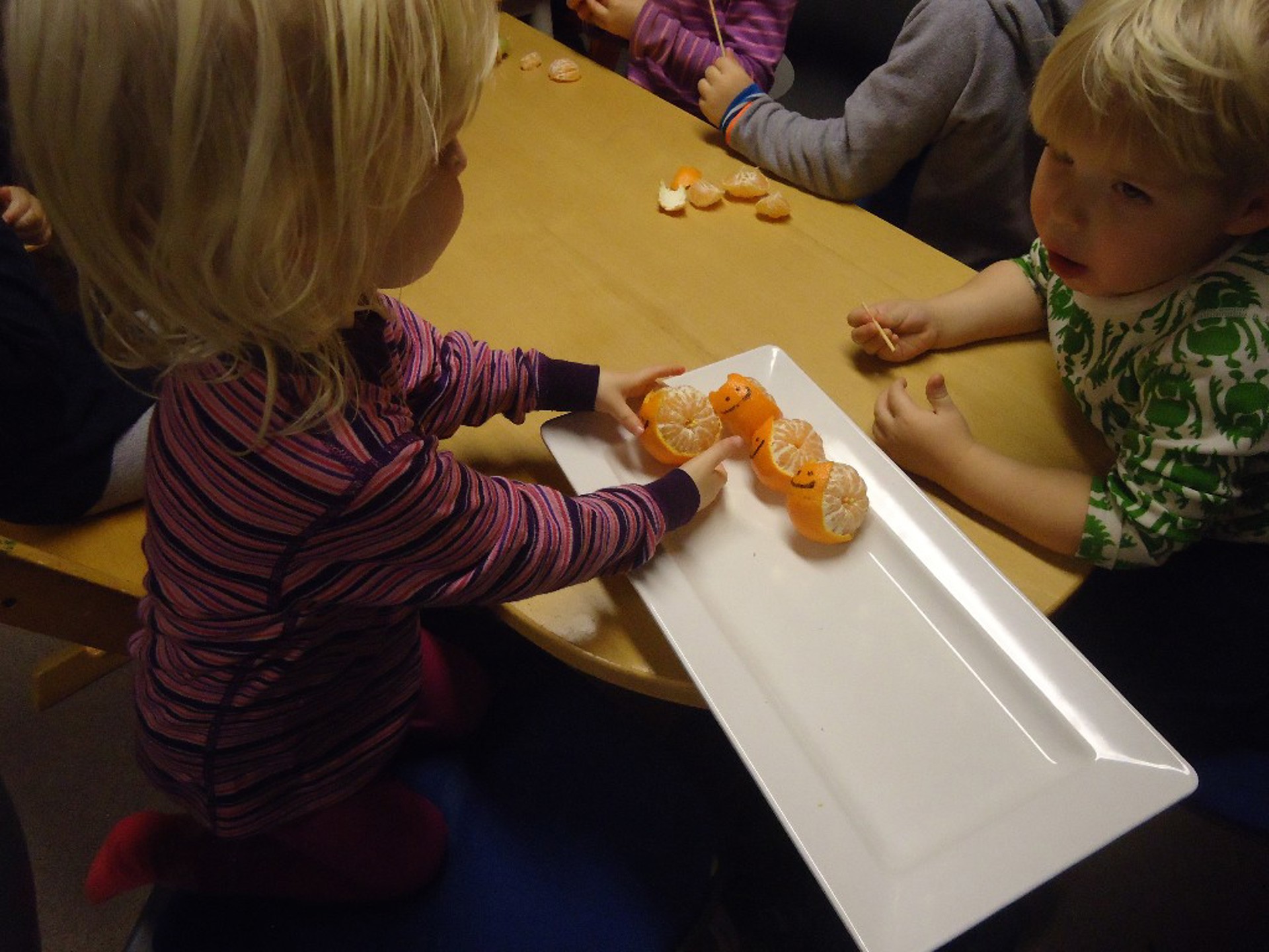 Vi gjør en vri når det gjelder bursdagsfeiringer. Nå lager vi spennende bursdag snadder med frukt og grønt sammen med barna. Disse klementinsneglene har barna på Blåmann fått hilse på to ganger denne høsten. Nå i desember smaker de ekstra godt også!
