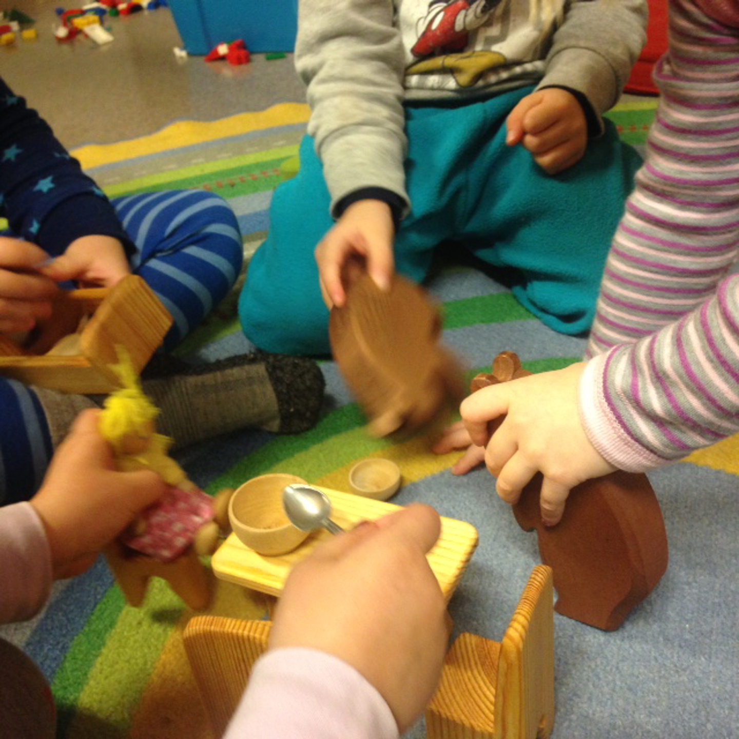 Museklubben jobber med eventyr om gullhår og de tre bjørnene. Etter en fellessamling for alle deler vi oss i små grupper og leker videre. Eventyret er kjent for barna og de prøver ut ulike roller som gullhår, bjørnepappa, bjørnemamma eller lille bjørn.
