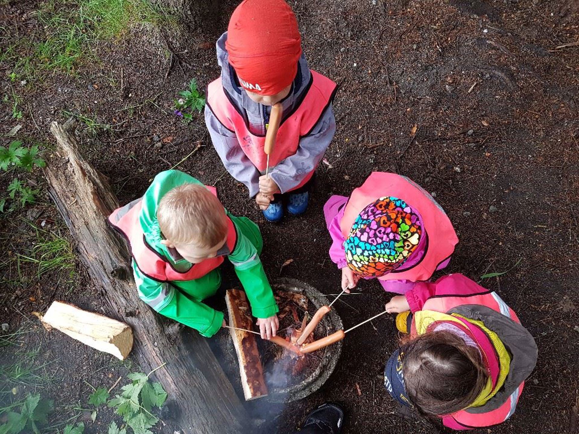 Fire barn fra Trehørningen var med Heidi på campingtur i skogen og grillet pølser. Spennende å være i barnehagen på sommeren også. Et av barna uttalte:" tenk at vi griller ordentlige pølser på vårt bål i skogen"