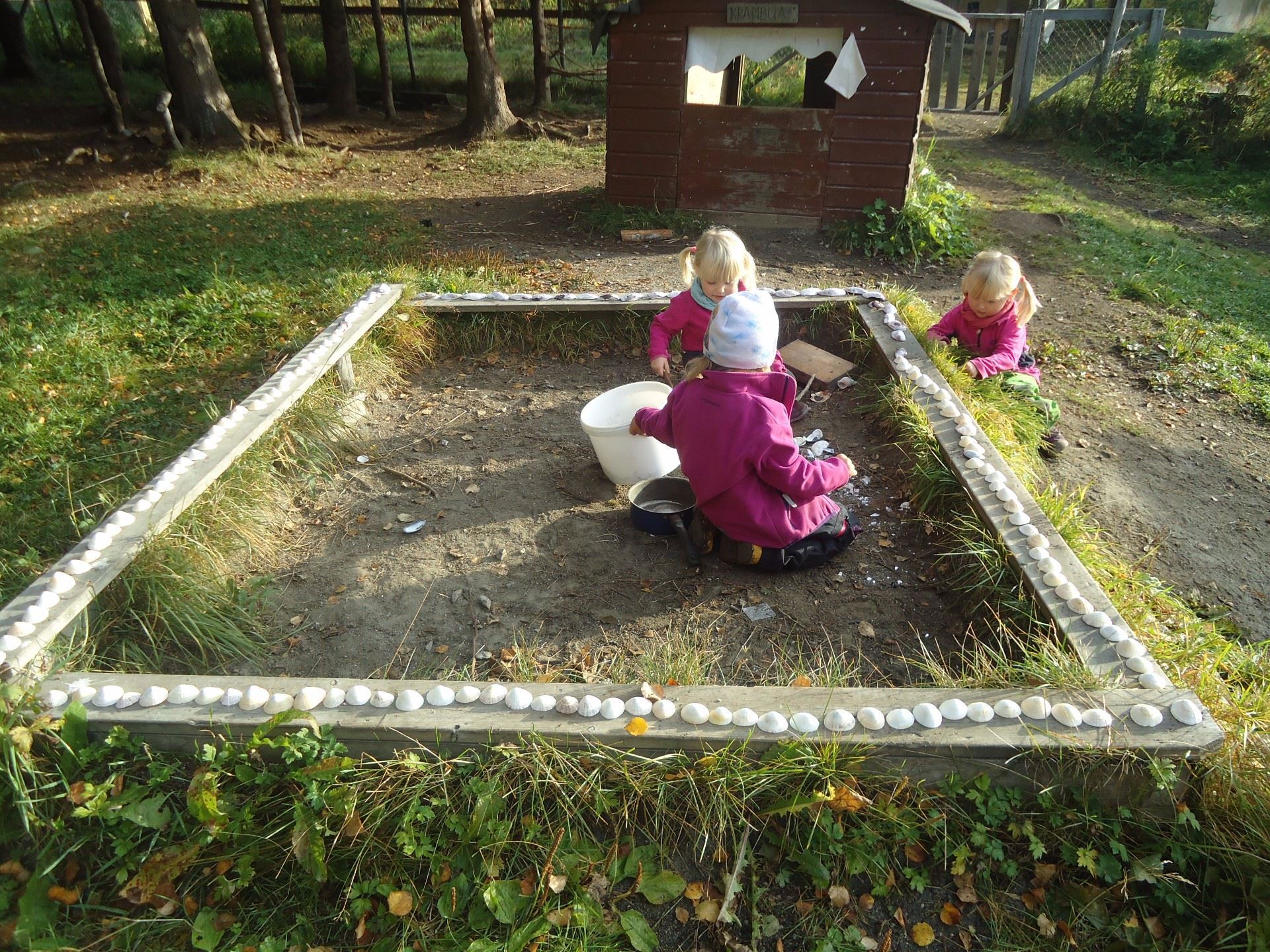 Det sies at det er på tidlig morgenen man er mest kreativ. Det er sant, fordi i morrest dekorerte vi den gamle sandkassa med masse hatteskjell. Det ble masse lek rundt dette blant de barna som var først levert.
