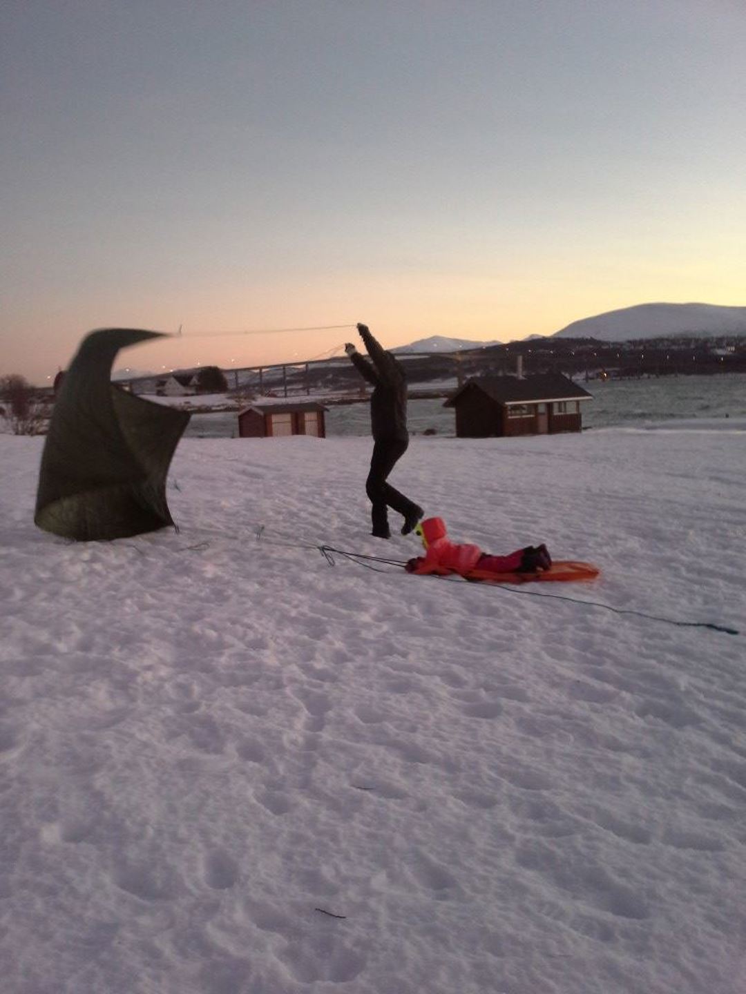 I dag var ganske mye vind, så det måtte vi utnytte på en artig måte. Da fant vi ut at vi kunne kanskje ordne en form for drage. Det blei ikke drage, men seil. Vi knyta fast en presenning til ei akematte, og seila avgårde.