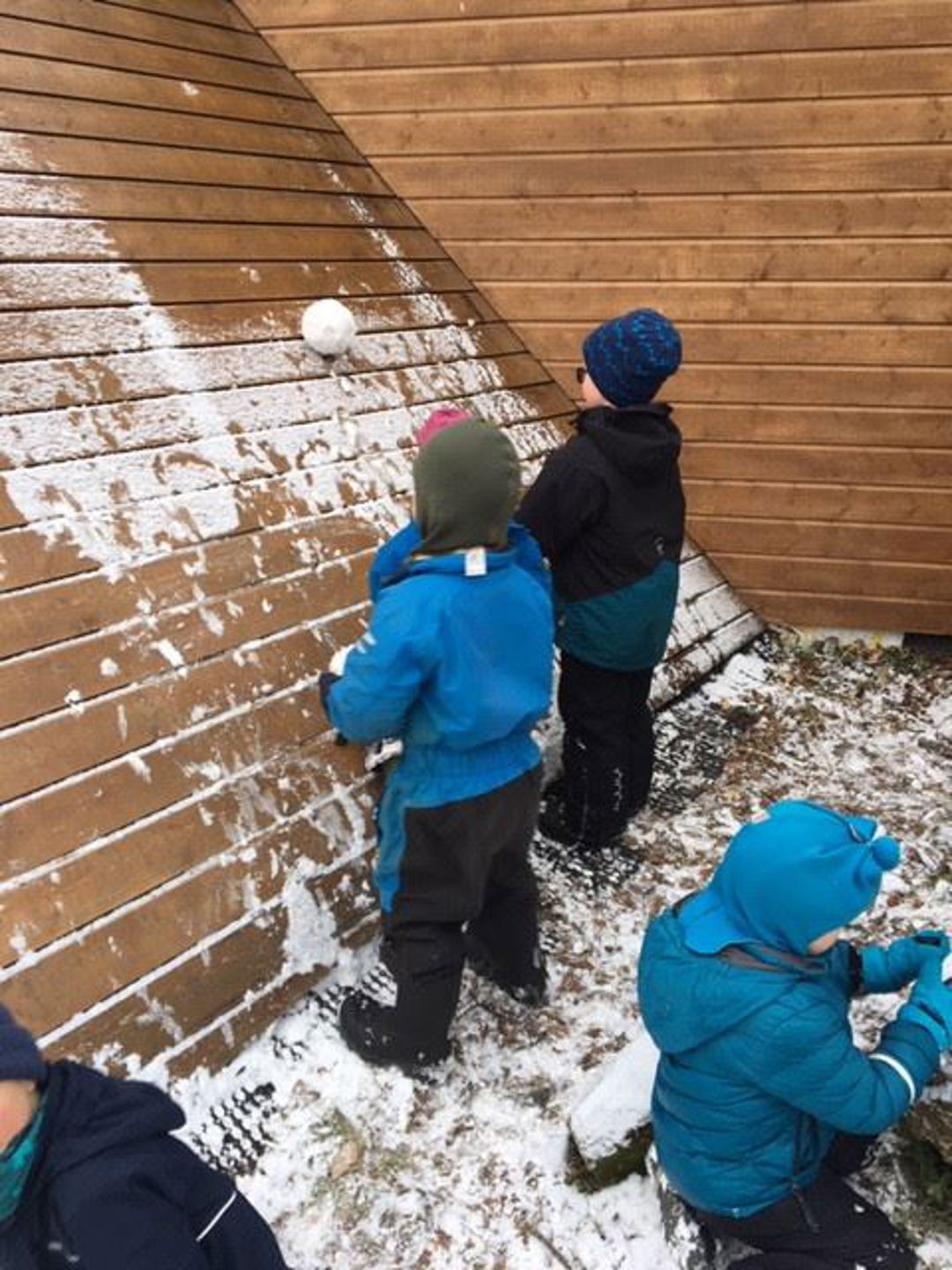 Natt til fredag kom de første snåfnuggene og til stor glede blant barna. Etter samling ville de gå rett ut i snøen. Det var nok snø til å lage snøballer men da barna testet akebakken, konkluderte de med at det må komme litt mer snø før vi kan ake.